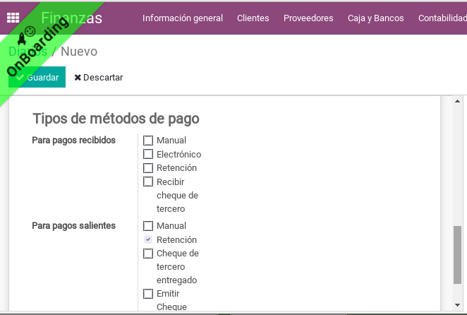 De esta manera se procede con la creación de los Diarios para todos los tipos de impuestos de retención (asumiendo el primer caso de configuración). Con la salvedad que en "Tipos de métodos de pago" en los de retención aplicada, será Retención para pagos salientes; y en los de retención sufrida será Retención para pagos recibidos.